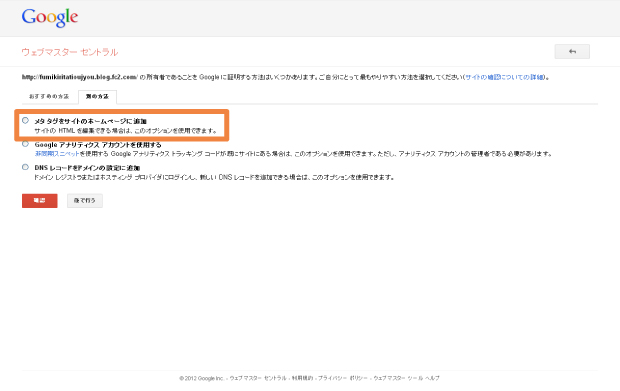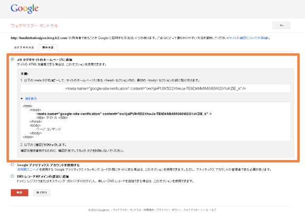 次にウェブマスターセントラルの文字があるページに飛び、確認方法を決定します。