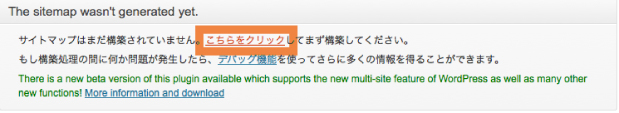 そうすると「sitemapはまだ構築されていません。『ここをクリック』してsitemapを作成してください。」という文が載った動作状態というウィンドウが開くので、ここで『ここをクリック』をクリックしましょう。